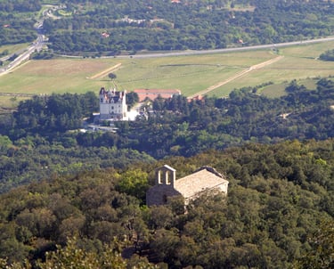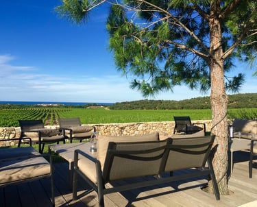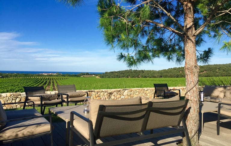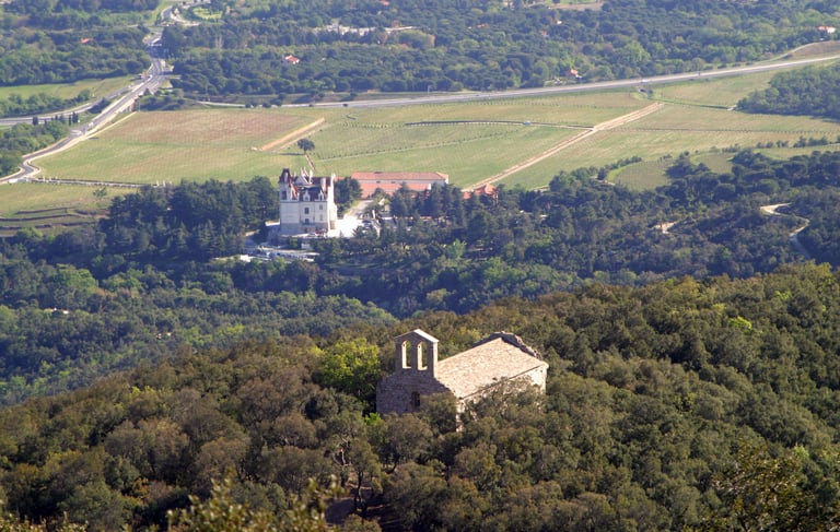 Ce lieu mêle architecture remarquable, vignoble et panorama : depuis les terrasses du domaine ou les abords du château, on domine la plaine du Roussillon, la baie d’Argelès et la ligne bleue de la Méditerranée.